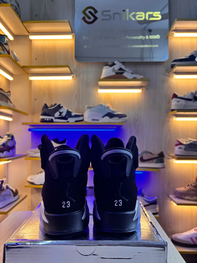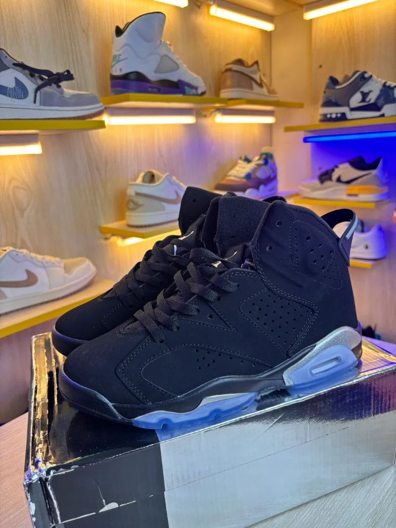 The Air Jordan 6 Retro “Metallic Silver” features a sleek black nubuck upper paired with shimmering metallic-silver accents and chrome detailing for a bold, modern aesthetic. The iconic AJ6 silhouette is preserved through its windowed tongue, lace locks and spoiler-heel design. Beneath it, a cushioned mid-sole and visible Air unit deliver comfort and support, while the translucent outsole completes the look with refined flair. Whether on the court or on the street, this edition strikes the perfect balance between heritage performance and high-shine street style.